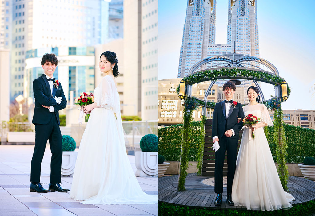 挙式・披露宴の最後は、ホテル内のカリヨン広場にて、アルバム用のイメージカットやスナップ写真を撮影。都庁を望む印象的な景観は、新宿のホテルならではの魅力です。
