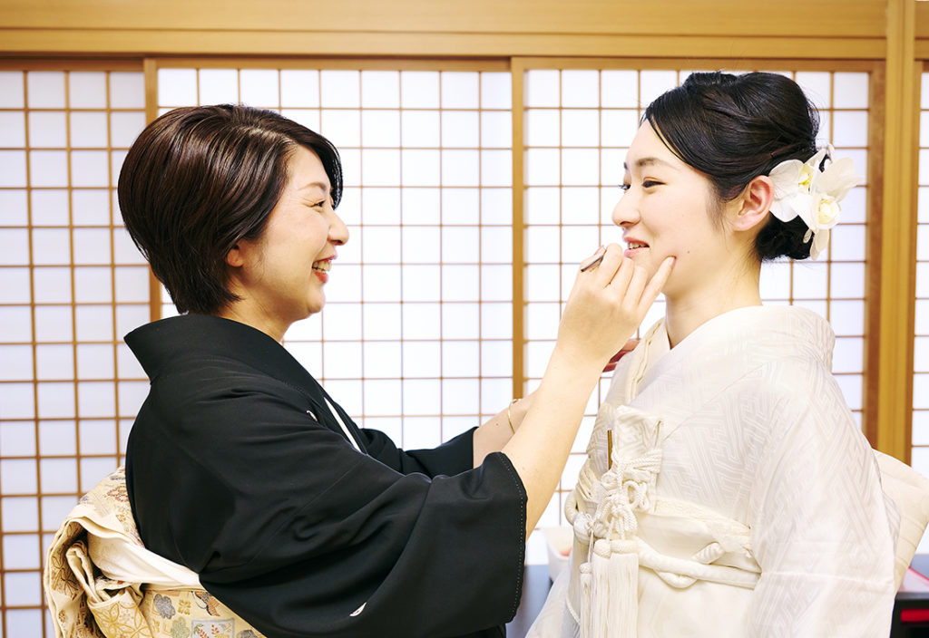 挙式プロデュースを行うメンバーは、各ヘアメイク、着付けスタッフに加え、挙式全体の管理や準備を行うスタッフ3名、カメラマン2名の約10名体制でサポートしております。